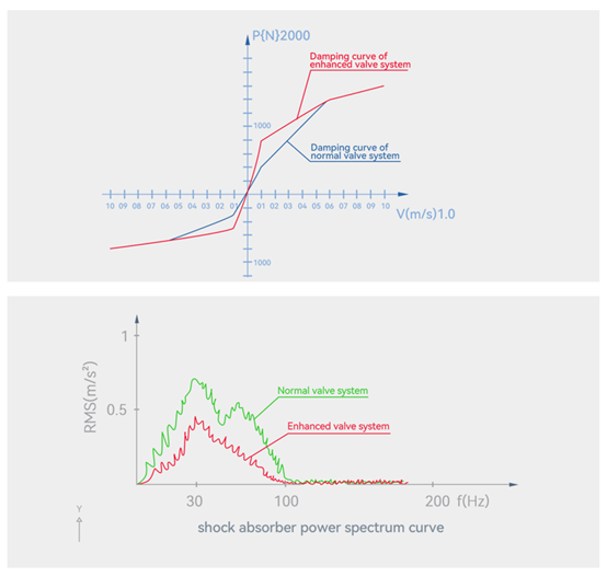 (Taking Toyota Corolla front shock absorber as an example, the damping curves and power spectrum curves with normal valve system and enhanced valve system are as pictures)